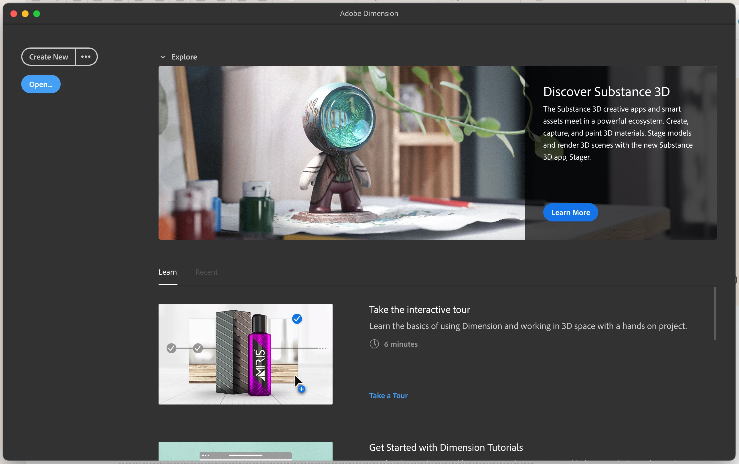 when I open the Adobe Dimension program (MacBook Pro, an initial dialog box opens, and when I want to open a file or create a new one, the panel gets stuck, the wheel spins, and the program does not work.