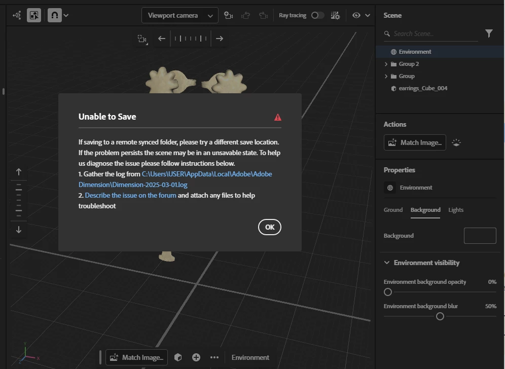 I can't save my Adobe Dimension file. For context, I have this 3D model downloaded from Adobe Stock that whenever I duplicate or put an image as decal, this error prompts whenever I try to save the file. It doesn't load & I need to end the task via task manager.