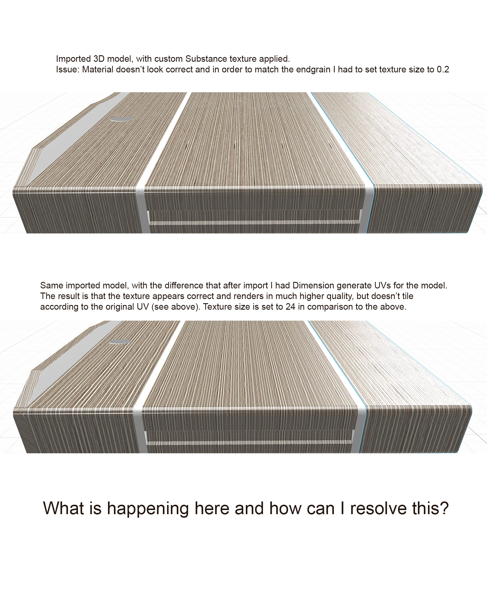 I have the following problem with the material not tiling correctly when Dimension generates the UV mapping for the 3D model. However, the materials applied look much higher quality when I do this than when I import and am using the UV mapping on my model. I am not a 3D person so might be missing something here? I have been working on this for days..and am about to rip my hair out... Thanks in advance for any tips!