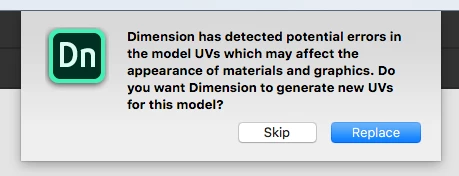 Replace: Dimension will generate new UVs for your model which will ensure there is no overlapping or out of bounds errors. This will allow you to place materials and decals on the model but if your model already had texturing done, those would no longer work with the new UVs.