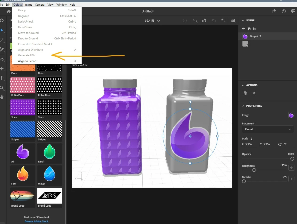 I'm trying to add a product label to my object, which is a square jar that is supposed to be a spice jar. I tried various methods, but overall, I selected "place Graphic on Model" under the "jar" scene. I then selected the image and it appears like below. I even dragged and dropped from my library and tried a stock photo as well. All of the images act as fills that are repeating rather than a decal.
