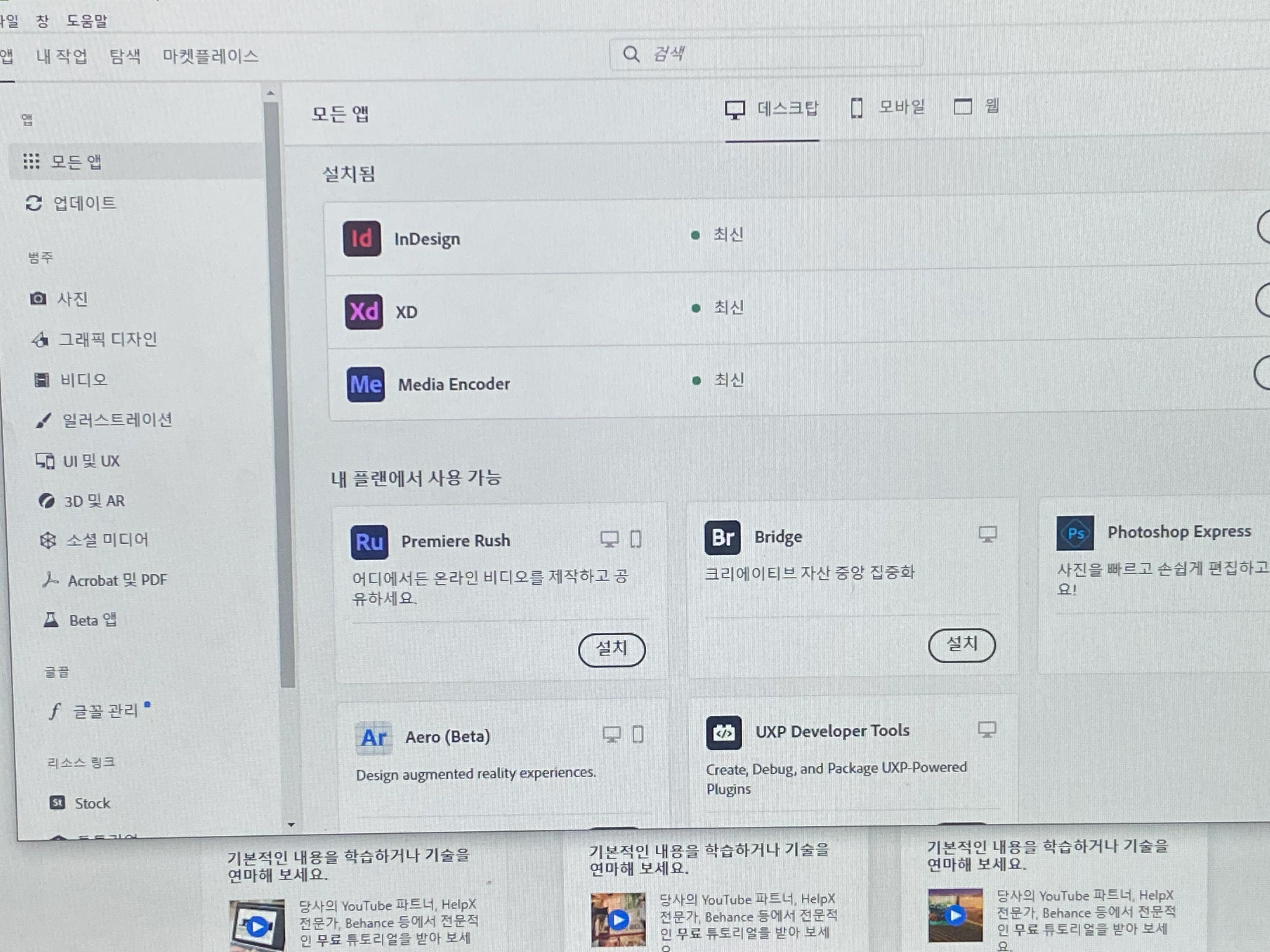 저는 분명 플랜을 구매를 해서 사용하는데 지금 크리에이티브 클라우드에서는 설치할수 있는 앱이 이렇게만 떠요 다른 방법들 다 했는데도 안돼서 물어보는겁니다.