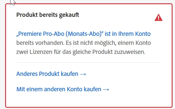 Ich hab mit einem Projekt begonnen (und mir dafür ein Abo von Adobe Premier Pro geholt). Da ich keine Zeit hatte habe ich das Abo gekündigt. Nun möchte ich es gerne fortsetzen, bekomme aber auf der Shop Seite die Fehlermeldung: