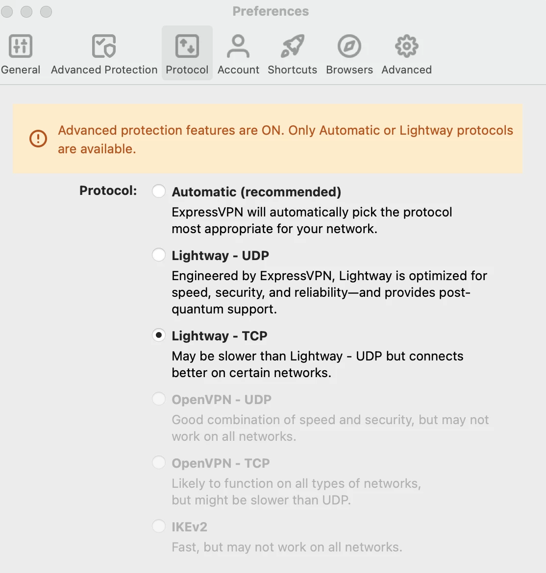 Switched ExpressVPN protocal to Lightway - TCP