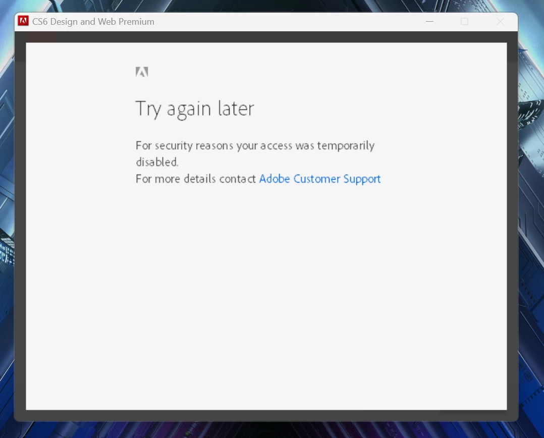 I am tring to install my copy of CS6 Design and Web Premium on a new Windows 11 laptop I installed it fine on my Windows 10 laptop in the past but on 11 I am getting an error of for your security access to your account was temporarily denied. I have an educational licence. I can sign into the website just fine only the program is throwing the error.