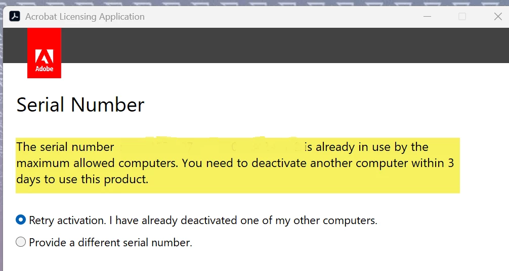 Ok, let's look at the software. Is there a 'deactivation' function provided? Not according to the screenshot provided. So, this is escalated to Support back-end five days later. As you can see, Adobe Support delivers a clear statement: "We regret to inform you that support is no longer available for the product you are enquiring about." Yet their own website states they DO provide support for Acrobat 2020 until the end of November 2025.