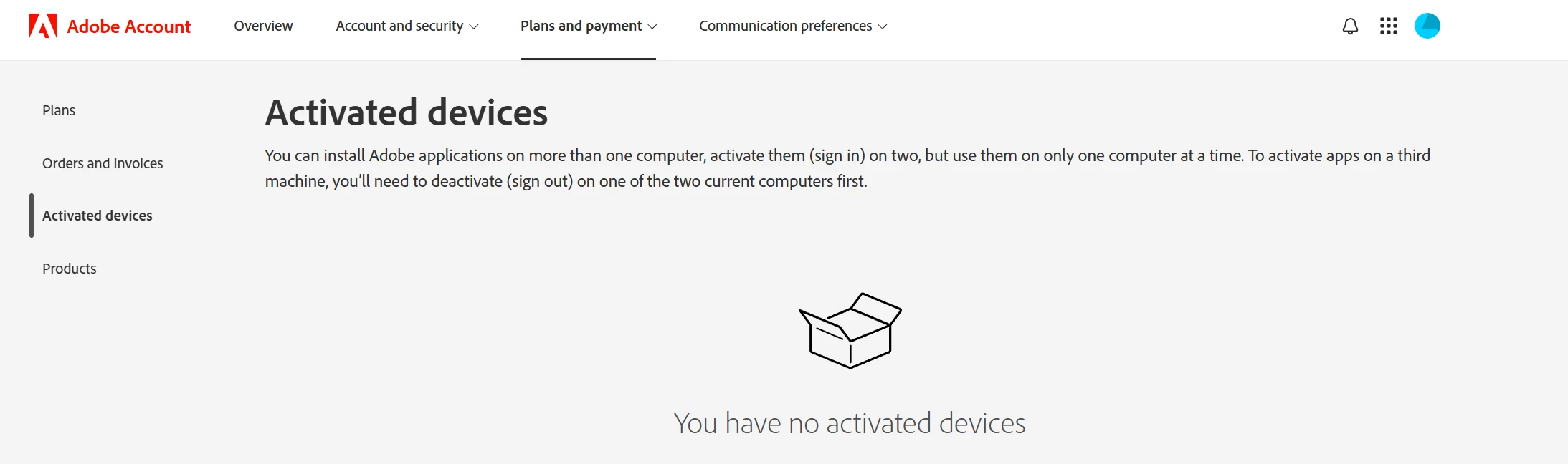 Now, let's look at the correspondence I get from Adobe when I get an activation failure notice. The Adobe agent tells me to 'deactivate' other installations. If an installation is uninstalled, it is deactivated by default. However, the Adobe website lists your activated devices – well, it would, if it actually worked. As you can see, the Adobe website clearly does not list any active devices, and the initial support I contacted stated there was none listed that he could see, either!