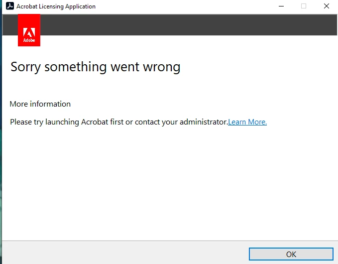 I recently bought Acrobat 2020 Student and Teacher edition. I went through the verification without any issue and the product appeared in my Account->Products. I downloaded the product from the link in that same webpage. When installing it, I introduce my email and password, and it seems to log in correctly, but after a few seconds loading the following undescriptive message appears: