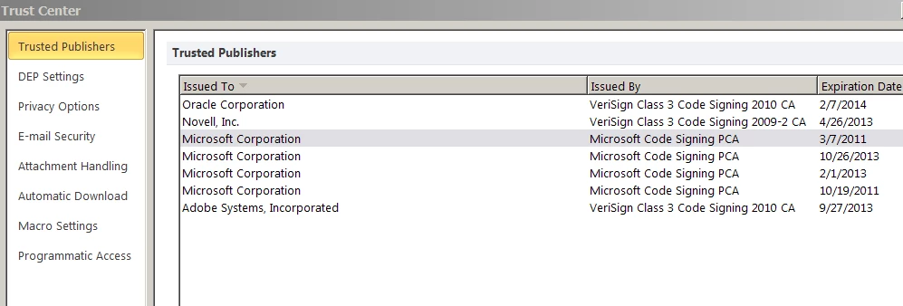 The add-in works great in Outlook 2010, Excel 2010, but not in Word 2010.  I manually installed the Trusted Pulisher Certificate for the add-in the the Trusted Publisher store as shown with no success either.