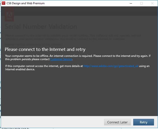 I reinstalled Adobe-CS6 Design & Web premium on our windows server 2016 but couldn't activate using the product key.