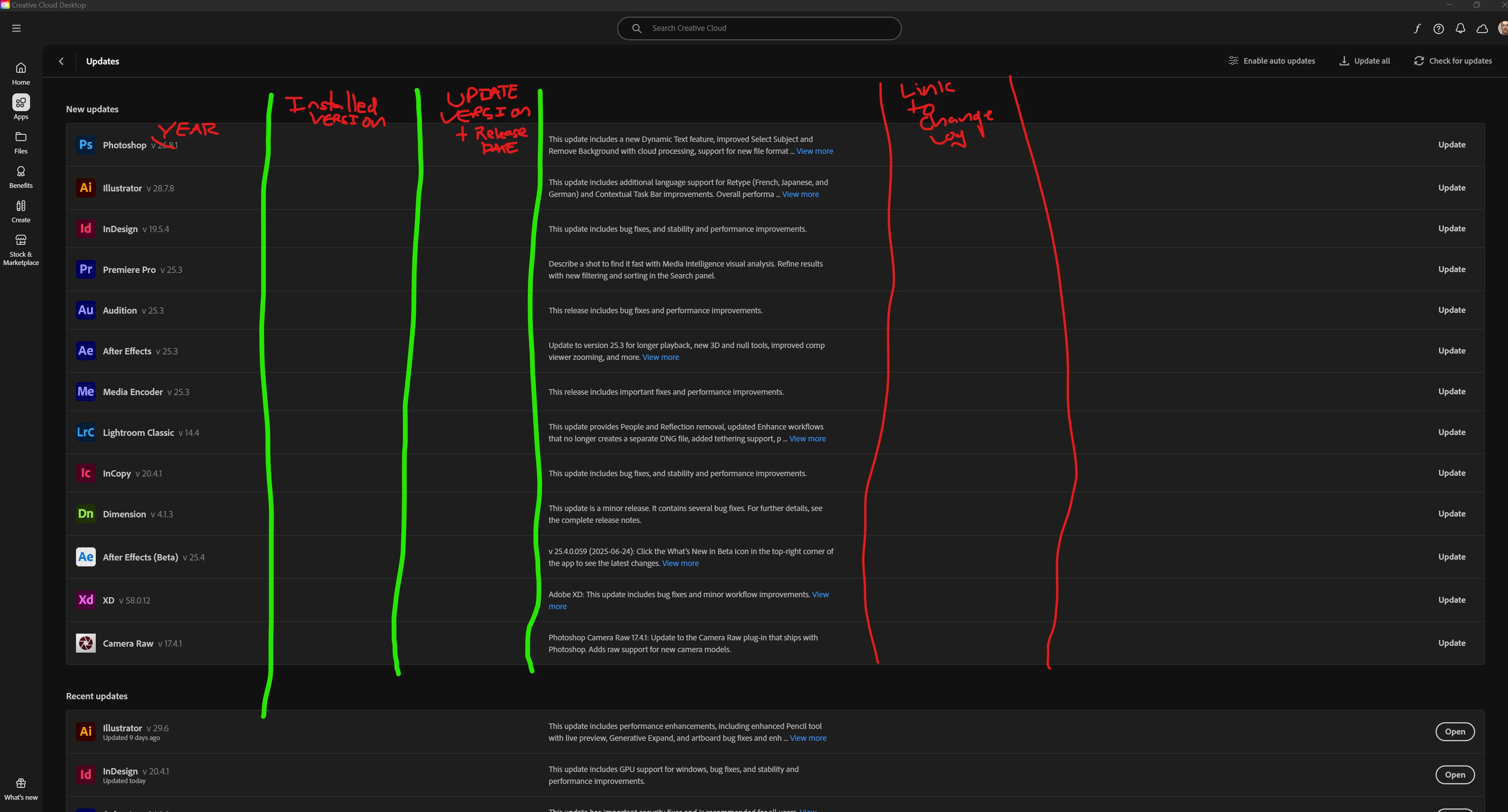 I often have the current AND previous version of an Adobe app installed at the same time (IE Illustrator 2025 for my daily driver, but Illustrator 2023 for a plugin I sometimes need to use). But in the Update tab of Creative Cloud Desktop I can't always tell which version is receiving the update if only one of them is listed (If both are listed I can see which version # is larger obviously) but if it is only one listed I have to look up if Illustrator which version number corresponds to the 2025 or 2023 release.