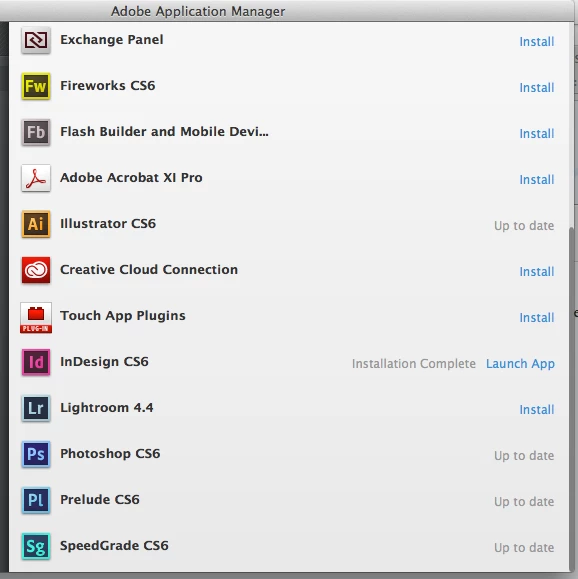 I don't have those programs on my computer. I once tried to install the entire Creative Suite with my OS not being current enough and thus decided to delete any and all traces/installers etc of them. As you know, InDesign was part of said Creative Suite, and InDesign is one of the programs the Application Manager currently allows me to download. It seems my problem may be a complicated one. Ugh.