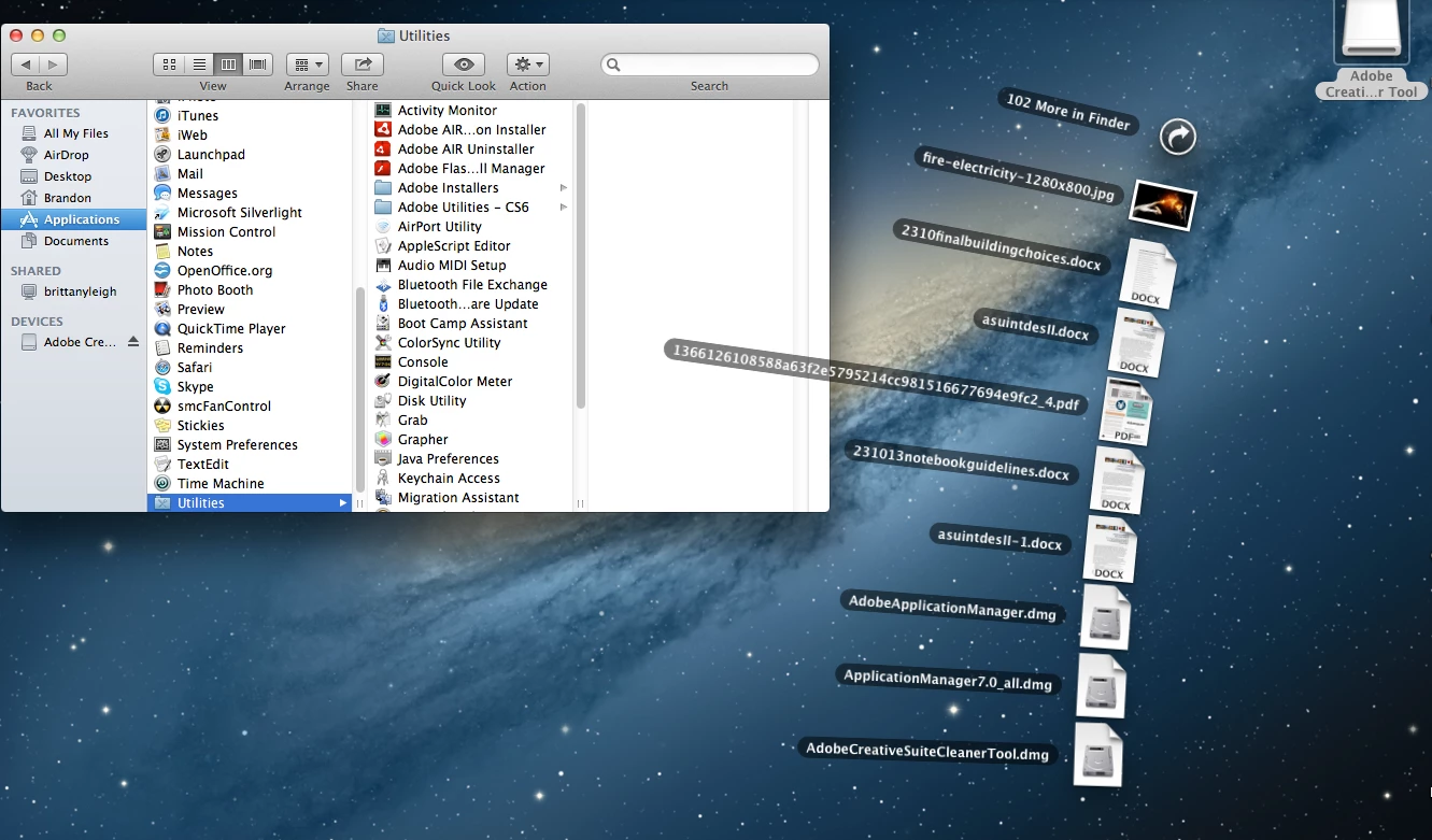 Here is an image of what Adobe related facets are still on my computer. Utilities in the finder window, creative suite cleaner on the desktop, and adobe related drivers?/programs in my downloads...
