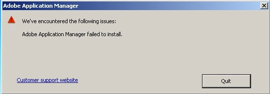 - The following error message appears: "Adobe Application Manager Failed to Install".