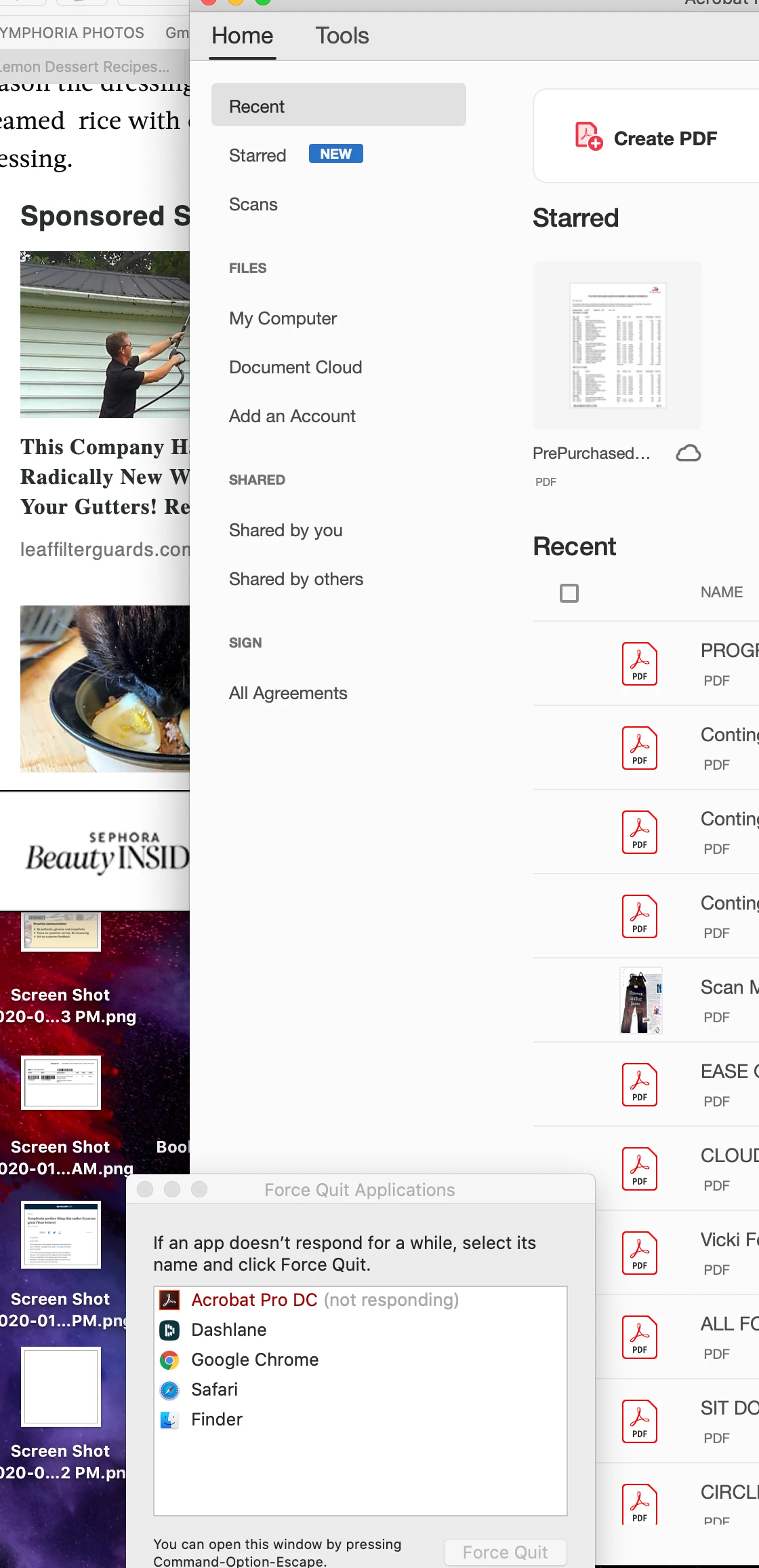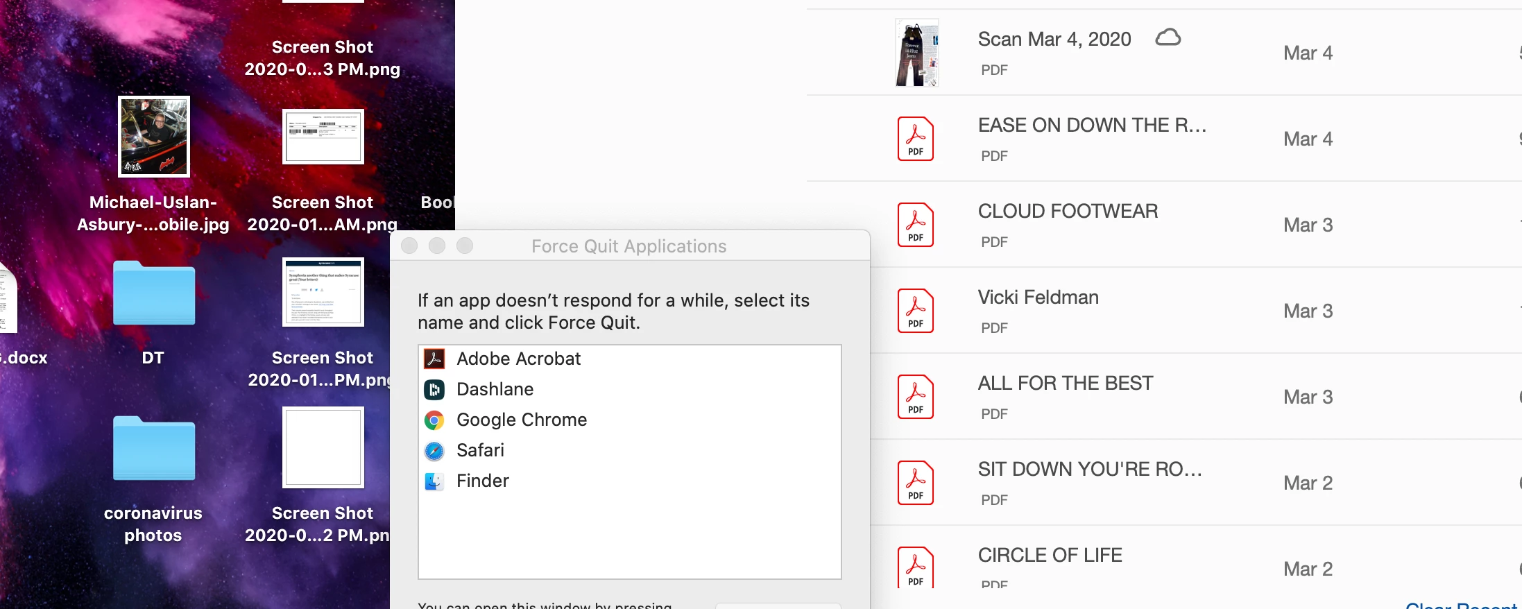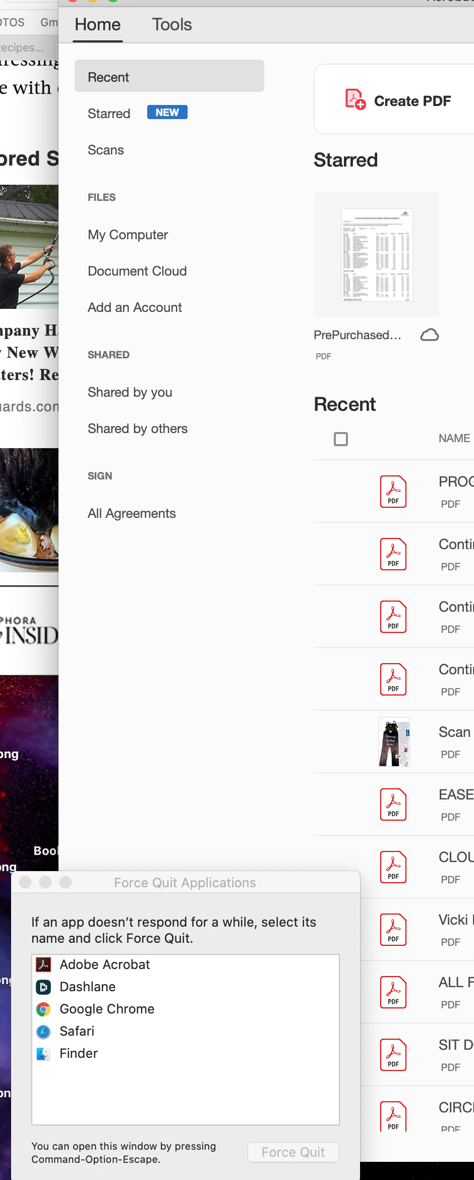 I have been using Adobe Creative Suite with Mac OS 10.15.4 (Catalina) with no issues. At 11 pm last night, the apps were fine. Today, everything is crashing. I can't open inDesign, Adobe DC, or Photoshop without getting the 'wheel of death,' and 'not responding' in the Force Quit window. Those are the apps I have tried to open, and the ones I cannot be without. I've got to get them working!
