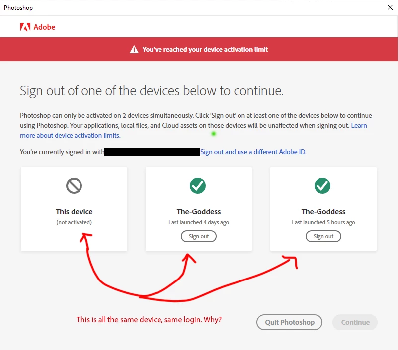 Adobe Cloud (PS keeps asking me to logout of the same computer I'm on)
