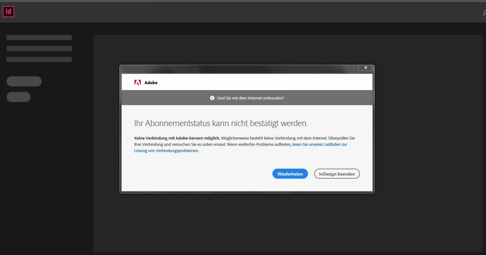 Since today InDesign and Creative Cloud refuse to connect to the server, Illustrator works fine though. It doesn't matter what Wifi connection I use, they both won't work.