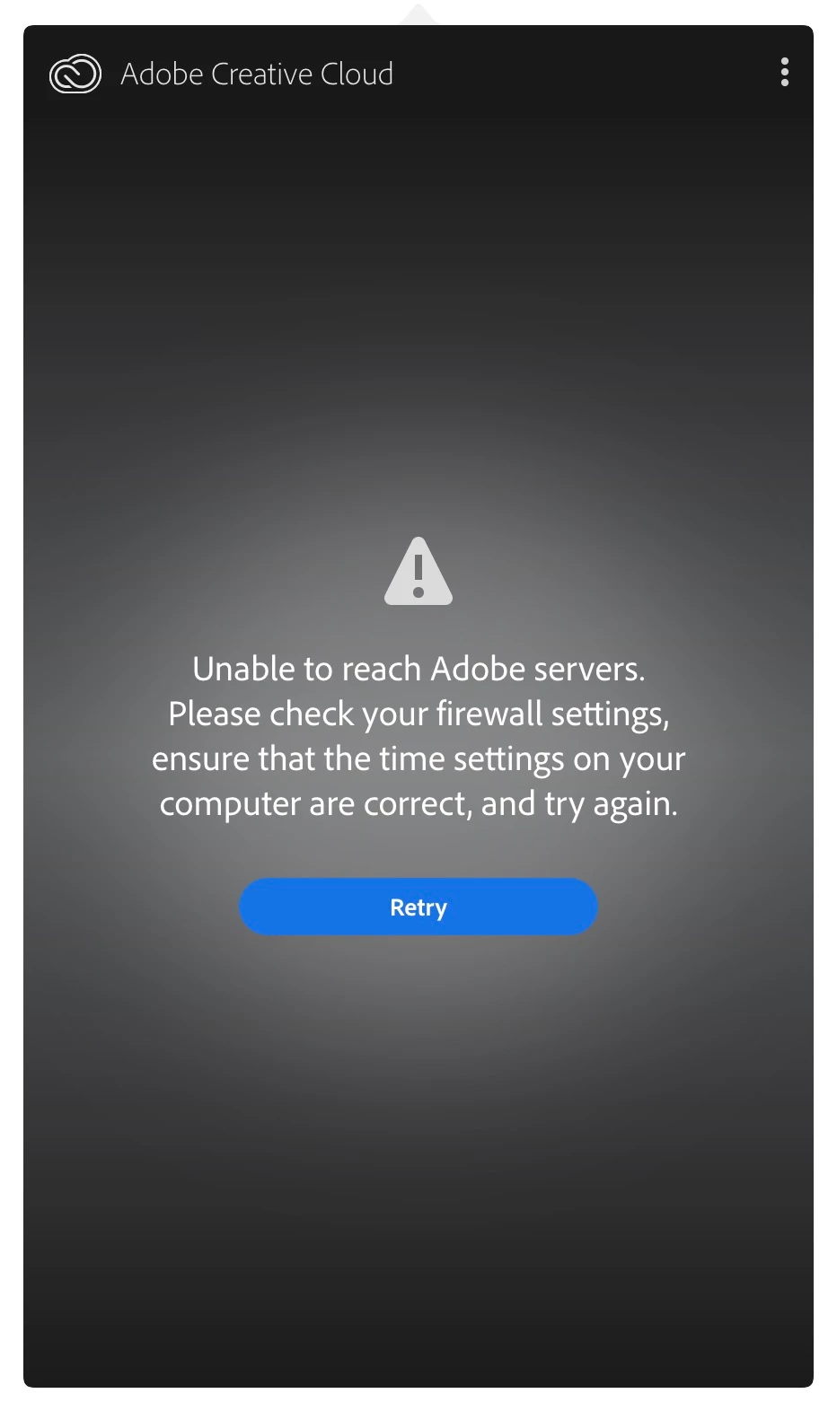 Don't know what happened, creative cloud app just can't connect to server since 2 days ago. I have never set any firewall and it is turned off. Quitting and relaunch doesn't solve the problem. Please help.