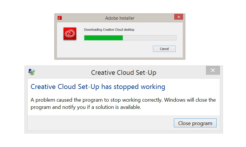 1) Downloaded to re-install the CC Desktop App, I get an error about 1/2 of the way through the setup "Creative Cloud Set-Up has stopped working".