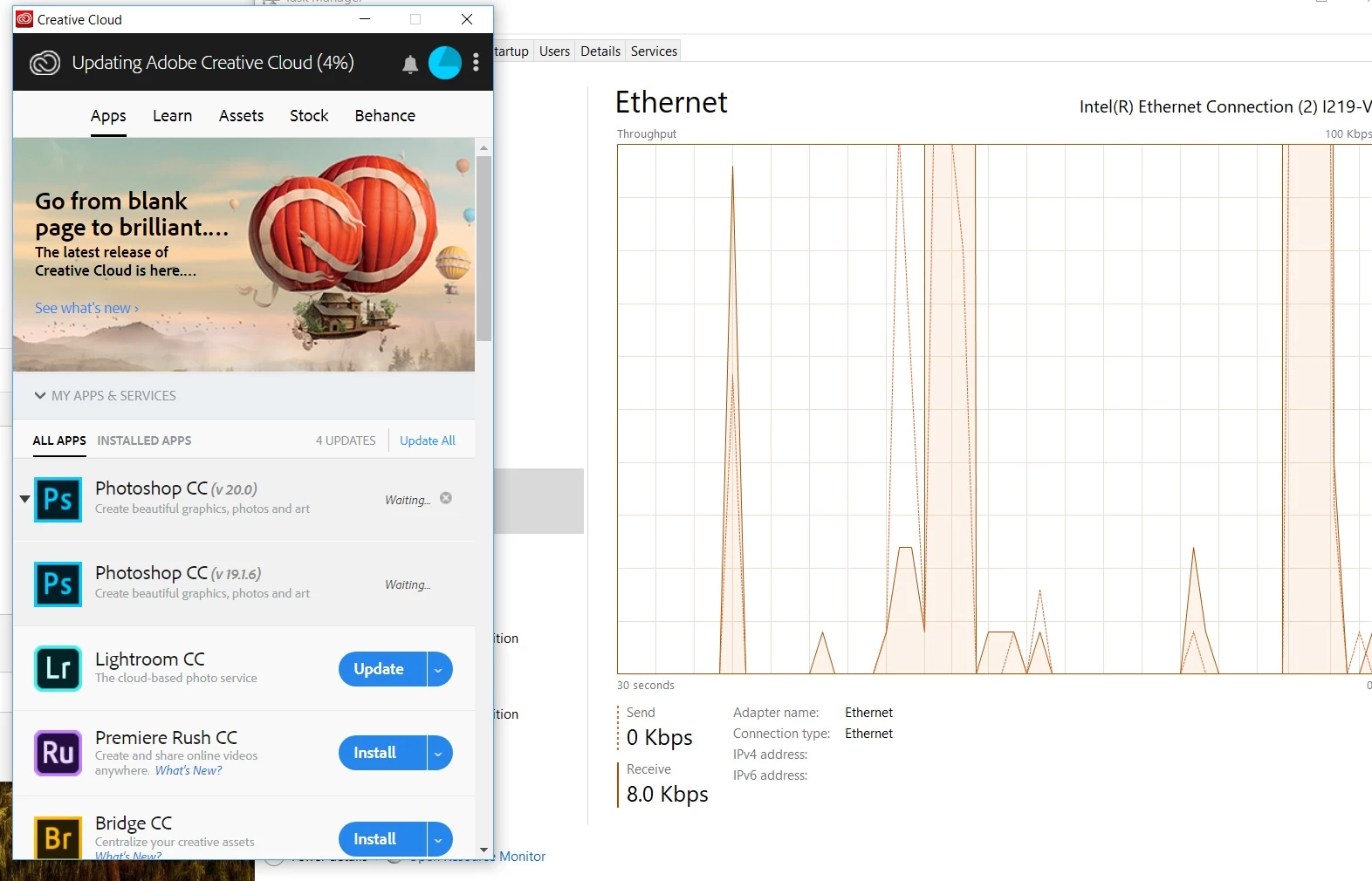 For some reason, any Updates/Downloads that i need to make through the Adobe Creative Cloud are extremely slow. As slow as to the point of taking 24 hours to update "4%" of Photoshop.