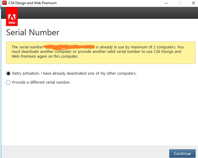 We have Adobe CS6 Design and Premium installed on our windows server, when we open any of the applications a window pop-up that 'the serial number is already in use by maximum of 2 computers'