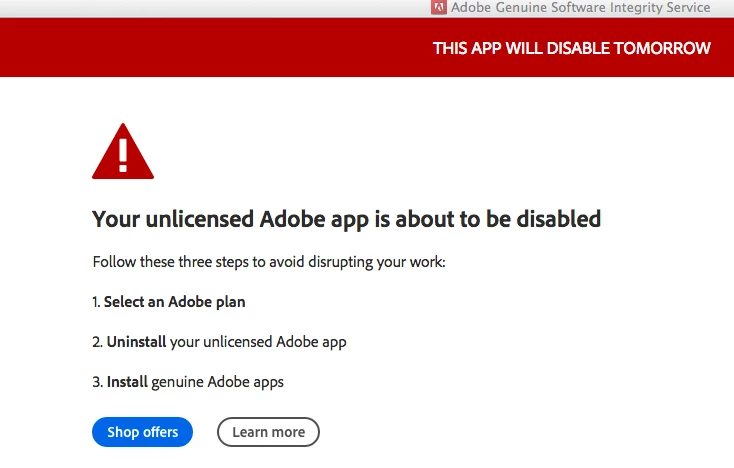 "Your unlicensed Adobe app is about to be disabled"