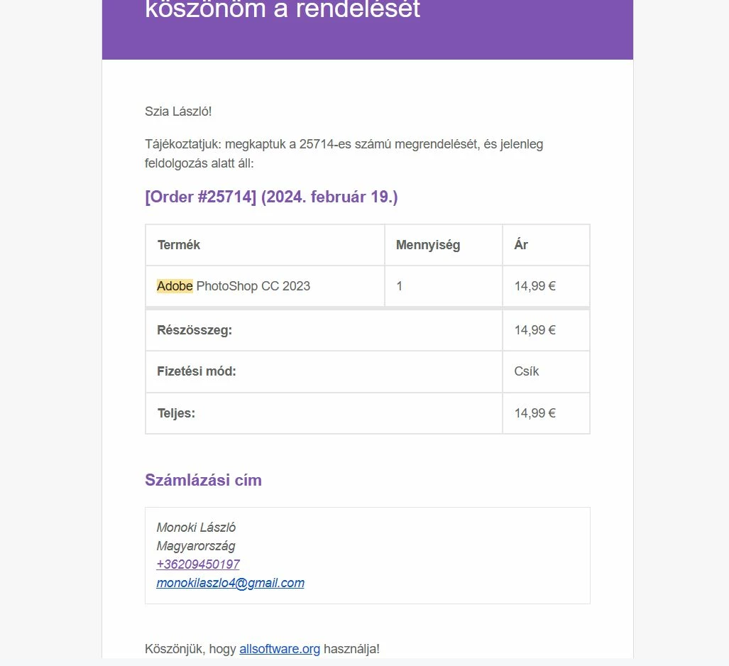 2024 februárjában megvásároltam az "Adobe Master Collection 2023" programot a is snsszelnsszel renlekezz ALL Sotware oldaláról legálisan és kifizettem az árát. A program többszöri újratelepítése után újratelepítése után is, mint illegális, licensszel nem rendelkező üzenetet küld az ADOBE.