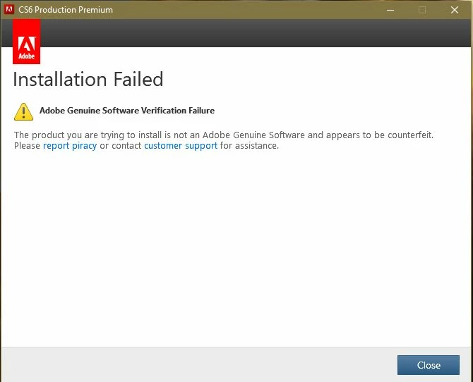 "Installation Failed The product you are trying to install is not an Adobe Genuine Software..."