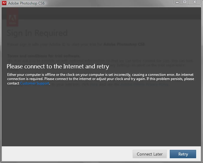 I have been trying to download Adobe Photoshop CS6 Trial but EVERYTIME I try to it says i need to connect to the internet or check my clock becuase I am not connected but I AM connected to the internet. See photo.