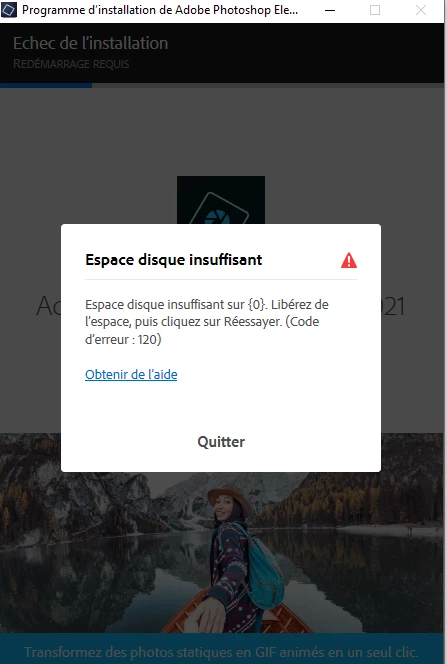 J'ai lancé une installation de Adobe Photoshop Elements sur un disque et lors de l'installation, un message d'erreur 120 apparait pour me signaler qu'il n'y a pas assez d'espace sur le disque. Il y a pourtant suffisament d'espace sur le disque dur en question. Comment dois-je procéder pour que l'installation fonctionne ?