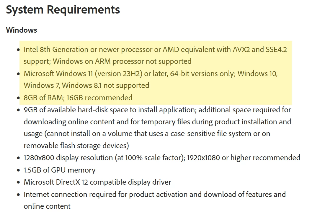 Adobe Photoshop is not compatible. Requires processor with AVX2 support.