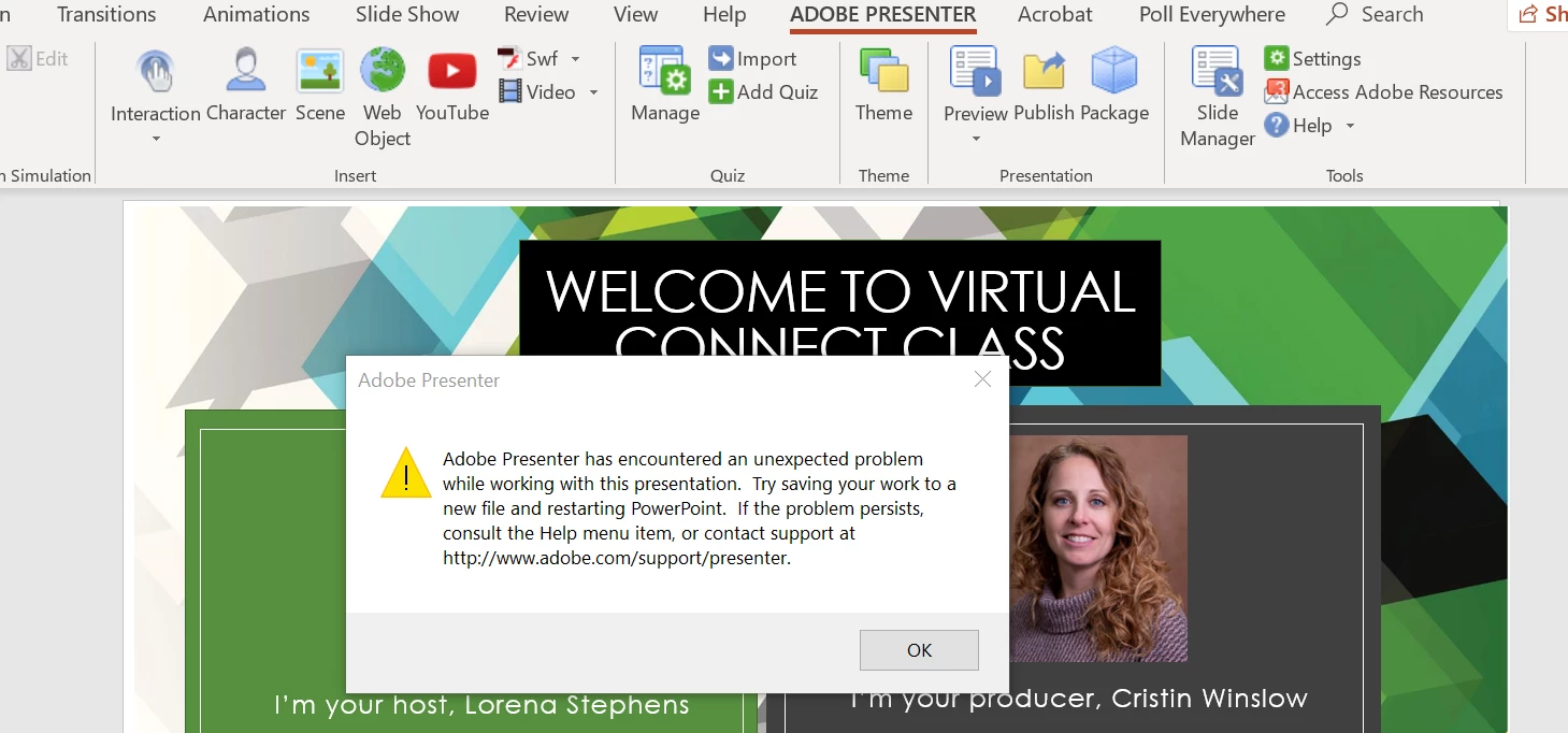 I just downloaded Adobe Presenter and the ribbon shows in PowerPoint. However, when I click on Settings I get this "unexpected" error. Currently signed up for the free trial but I'm stuck here. Any help would be appreciated. I've tried restarting my computer and re-installing Presenter.
