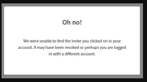 "Oh no! We were unable to fin th invite you clicked on in your acount. It may have been revoked or perhaps you are logged in with a different account".