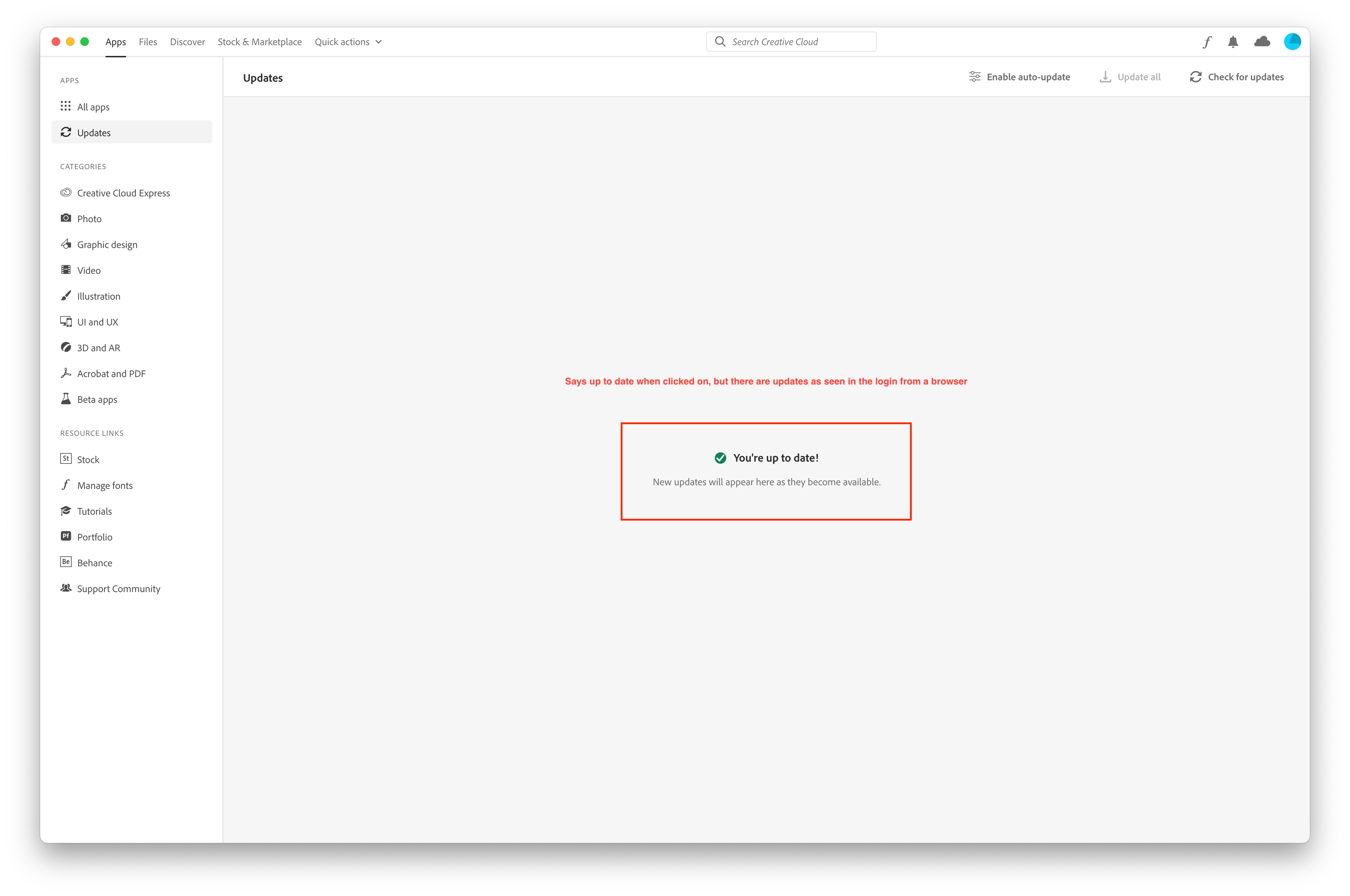 My Adobe Creative Cloud Desktop App hasn't been giving me program updates on the apps I have on my computer currently, to update.