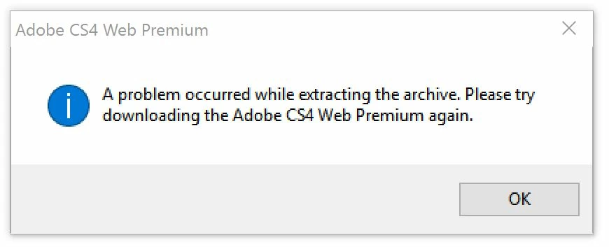 I have tried to download Adobe Web Premium CS4 four times now on two different computers for re-installation (windows).  Each time I use the download link: https://helpx.adobe.com/creative-suite/kb/cs4-product-downloads.html.  It takes ages to download and once complete I get the message "A problem occurred while extracting the archive.  Please try downloading Adobe Web Premium CS4 again."  Any idea how I can re-install?