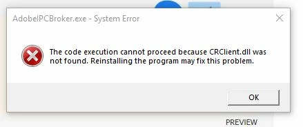 I randomly started getting this error message titled "AdobeIPCBroker.exe - System Error" the test says "The code execution cannot proceed because CRClient.dll was not found. Reinstalling the program may fix this problem."