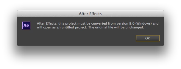 When I opened the template I received the following message: "After Effects: this project must be converted from version 9.0 (Windows) and will open as an untitled project. The original file swill be unchanged."