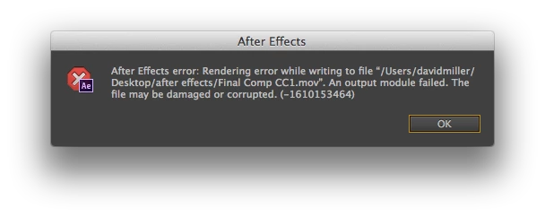 Following the AE template author's instructions I was able to customize the template, editing text, importing my movies. When I added the "Final Comp" to the Render Cue, and then started rendering, I immediately got the following error: "After Effects error: Rendering error while writing to file '/Users/...Final Comp.mov'. An output device module failed. The file may be damaged or corrupt. (-1610153464)"
