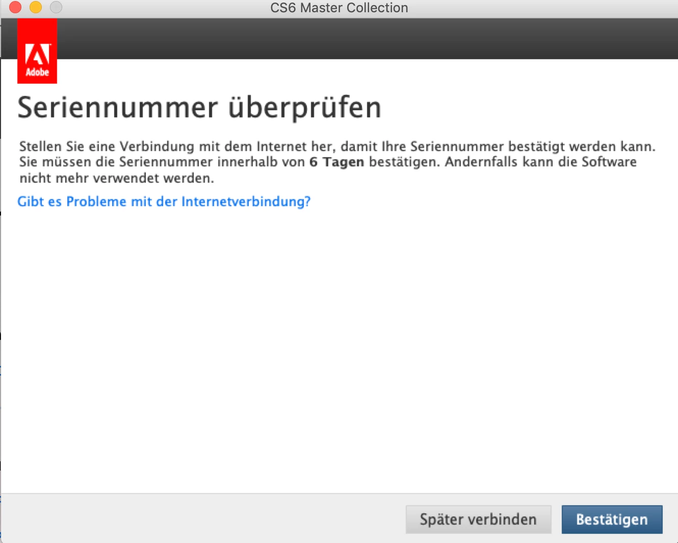 Bei der Installation nach korrekter Eingabe des Product-Keys (kein Eingabetippfehler) taucht jetzt immer wieder der selbe Fehler auf: Ich habe mit dem Mac angeblich keine Internetverbindung. Das stimmt nicht, ich kann beliebige Webseiten anwählen. Ich gebe den Product-Key ein und komme nicht weiter.