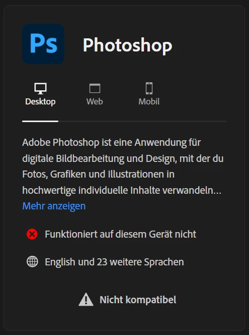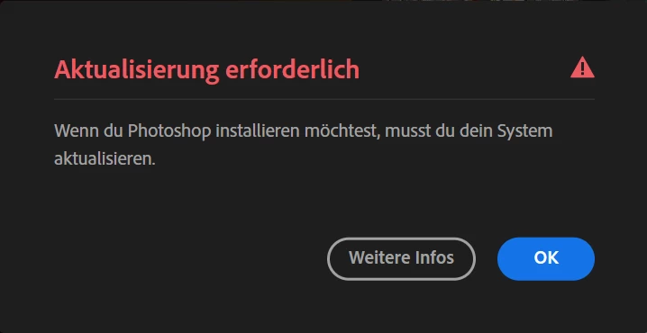 Außerdem bekomme ich angezeigt, dass alle Programme nicht kompatibel wären. (Ja, auch Acrobat, was ja selbst auf alten Krücken von Anno dazumal läuft). Ich hab euch die beiden Screenshots der Fehlermeldungen beigefügt, meine Systeminformationen findet ihr unter den Screenshots. Die beiden Fehlermeldungen bekomme ich bei allen Programmen von Photoshop bis Acrobat. Die Creative Cloud ist eine DGM-Datei, die sich nicht einzeln installieren lässt, sodass ich vorher eine App wie z.B. Photoshop installieren müsste.