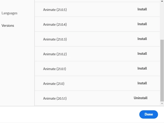 Hi, i have installed Animate (20.5.1), but i can't able to install previous versions (2019.2) like that, because creative cloud shows installed above versions only, can you please assist me to install below versions.