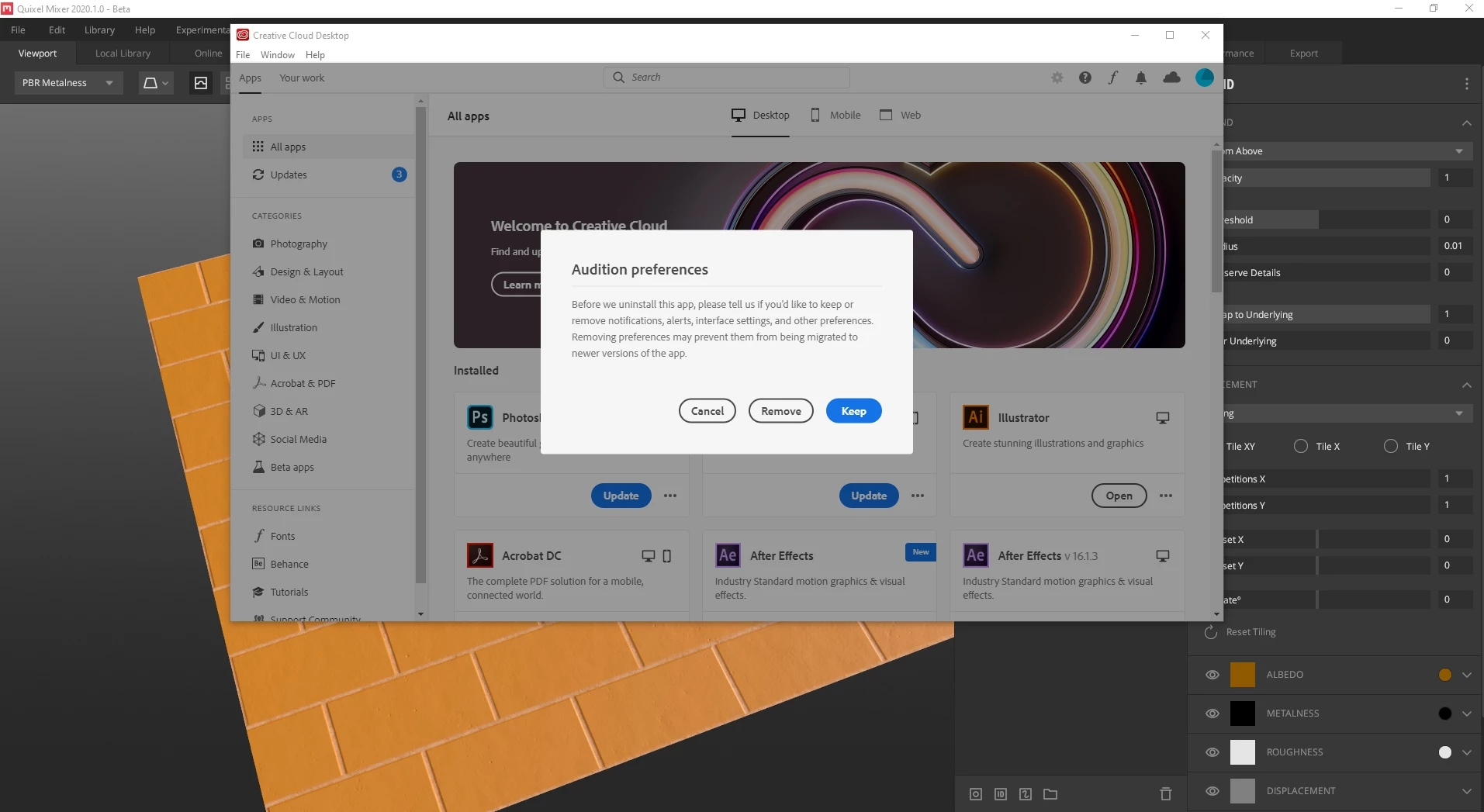 I uninstalled some of the applications from creative cloud application. These were Audition and character animation app Fuse i guess. since then, whenever i work with other applications like Quixel Mixer, Cinema 4d, this screen pops up and it doesn't matter which option i choose it keeps popping up, blocks me sending commands and this is slowing me down dramatically.