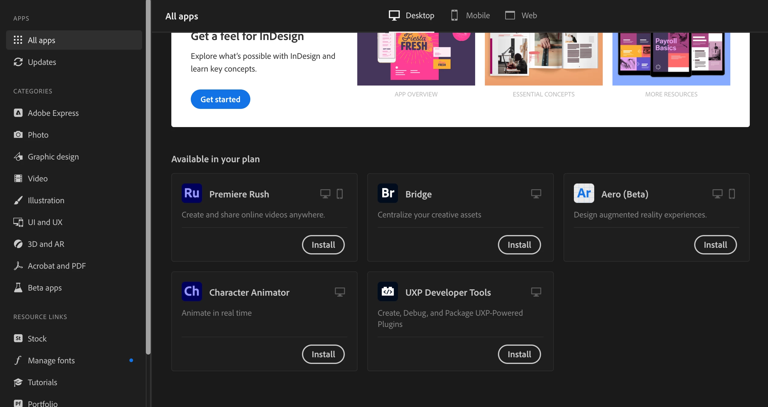 Contratei o plano Todos os Apps, mas ao baixar e instalar o Creative Cloud Desktop, estes apps não aparecem como disponíveis. Os apps aparecem no CC Web, mas ao clicar para instalar, abre o CC Desktop, porém, nada acontece.