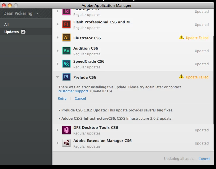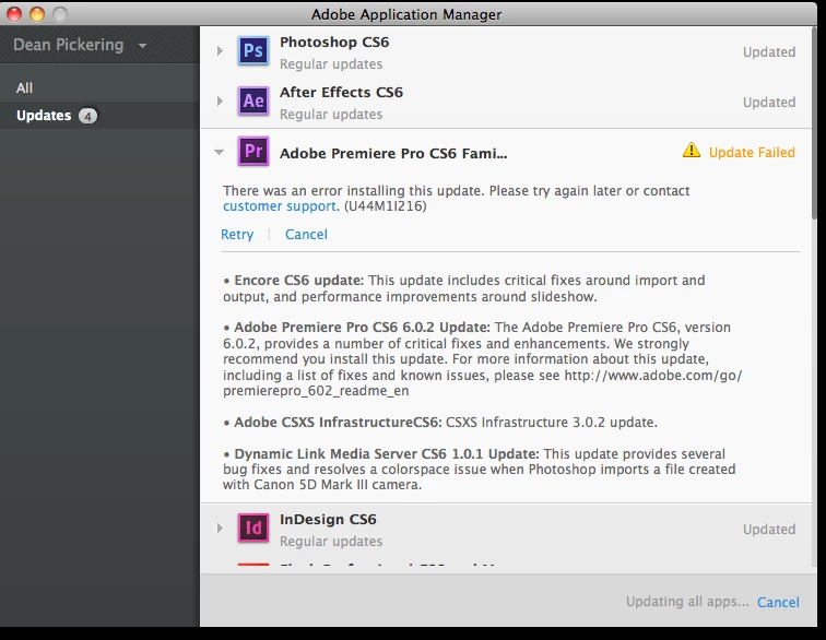 After several attempts with support procedures and updating the App Manager to v. 7.0.0.189, most software updated but four did not: Premier Pro CS6 Family, Illustrator CS6, Prelude CS6 and CS6 Camera Raw. The error code for each is the same stating: "There was an error installing this update. Please try again or contact customer support. (U44M1|216)". Contacting customer support brings me to the forums and questions that have nothing to do with this problem.