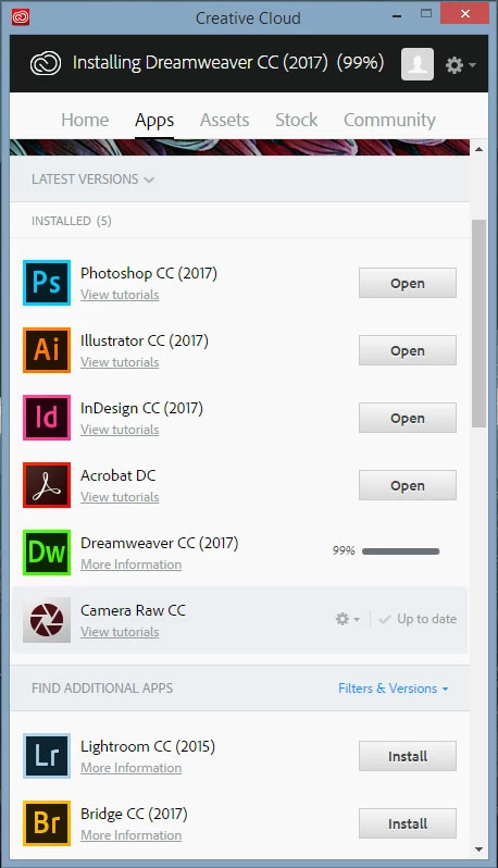 In the example below Photoshop Illustrator InDesign all hung at 99% and are useable after restarting the computer except Acrobat DC which stuck at 85% and is now usable after restarting the computer.