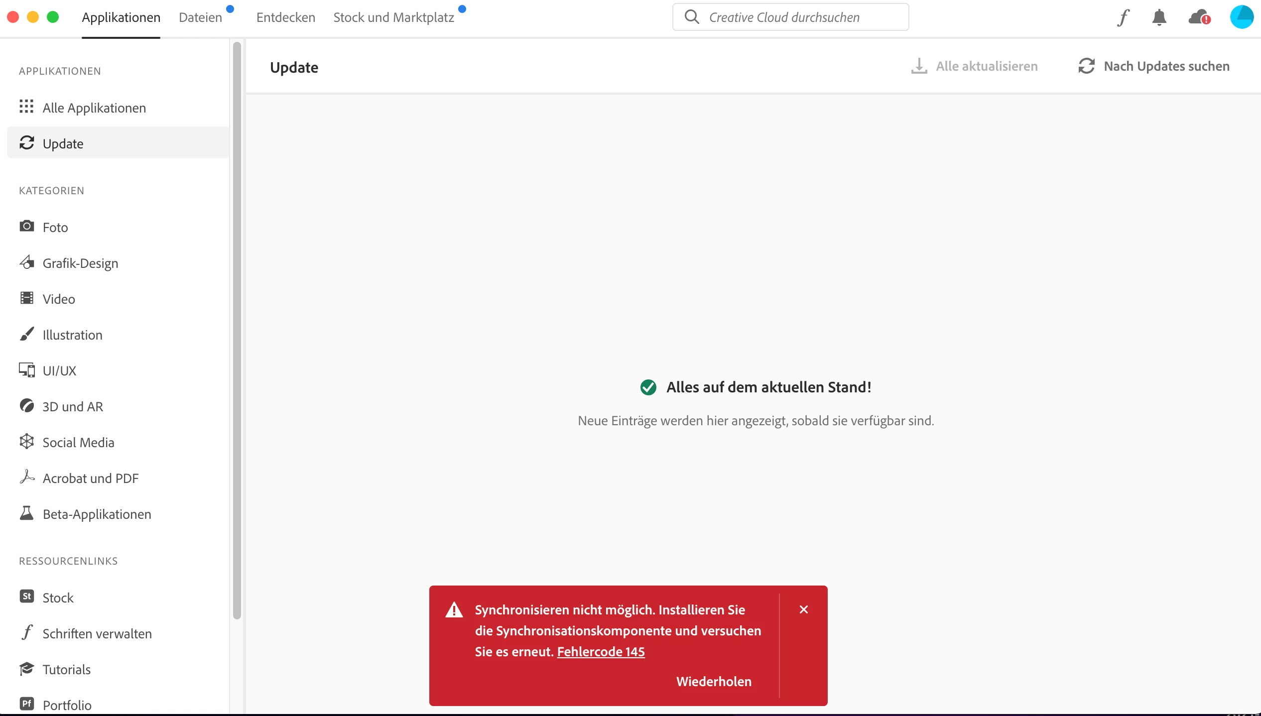 4.) Error 145 "Sync not possible. Install the syncrhonization component and try again. Error code 145" (= Update cant be made)