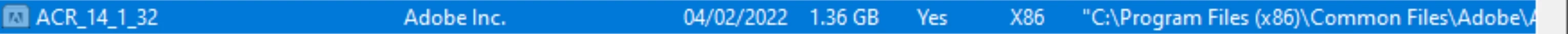 Full information = ACR_14_1_32 | Adobe Inc. | | 04/02/2022 | 1.36 GB | HKEY_LOCAL_MACHINE\SOFTWARE\Wow6432Node\Microsoft\Windows\CurrentVersion\Uninstall\ACR_14_1_32 | Unknown | "C:\Program Files (x86)\Common Files\Adobe\Adobe Desktop Common\HDBox\Uninstaller.exe" --uninstall=1 --sapCode=ACR --productVersion=14.1 --productPlatform=win32 --productAdobeCode={ACR-14.1-32-ADBEADBEADBEADBEADBEADBE} --productName="Camera Raw" --mode=1 | |