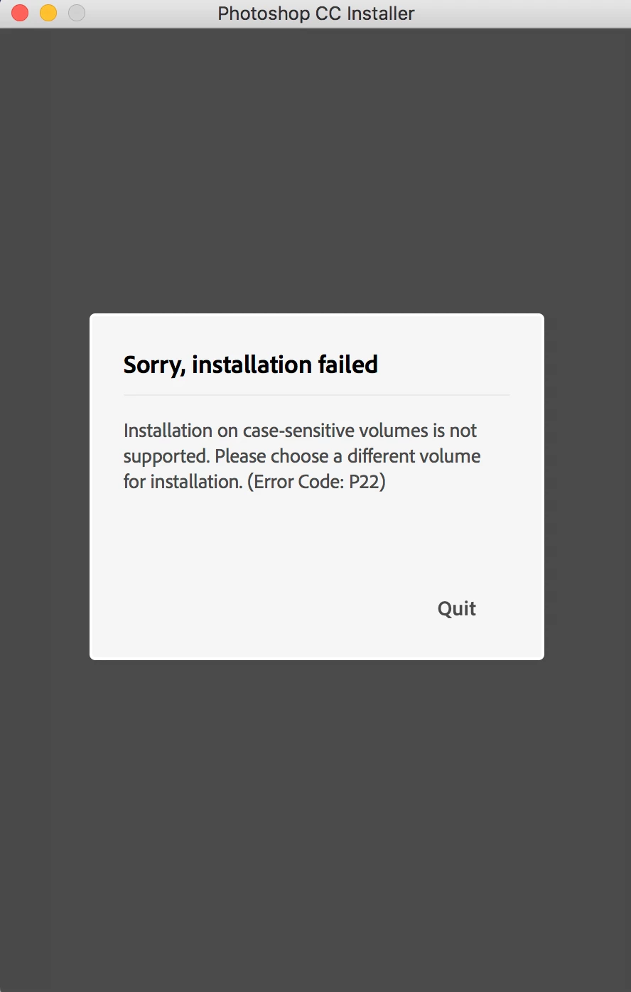 Installation on case-sensitive volumes is not supported. Please choose a different volume for installation. (Error Code: P22)