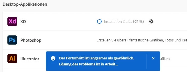 I can no longer install Adobe XD. All other Adobe programs, however, do. I removed and reinstalled everything with the Adobe CleanerTool. The same problem every time. All programs except Adobe XD can be installed. The installation process hangs up at some point, sometimes at 60%, sometimes at 90%. No error message is displayed, even after waiting for several hours.