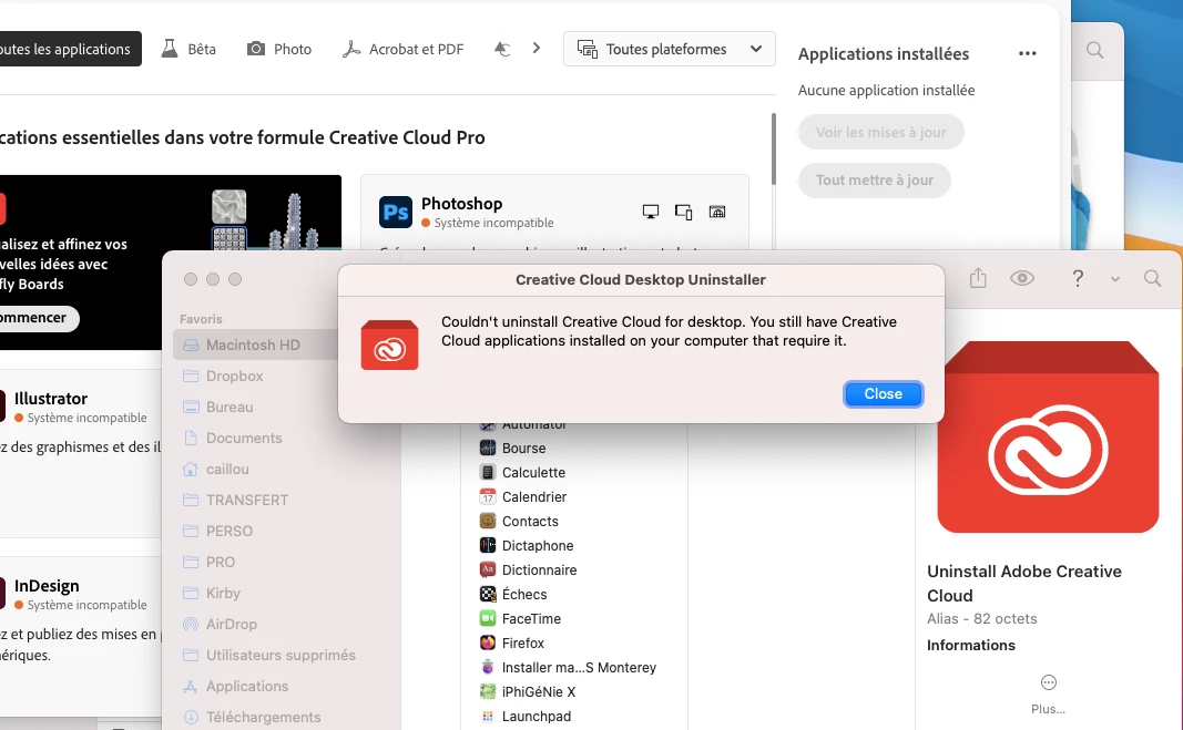 Hi, i would like to uninstall all my adobe apps on my old macbook air at home (I still use all the app on my office on a new imac) to free some space, but i can’t unistall creative cloud. I uninstall every app before (it’s the correct status on the creative cloud tell me that, see the screenshoot) but the uninstall program stop because …there's still some app.
